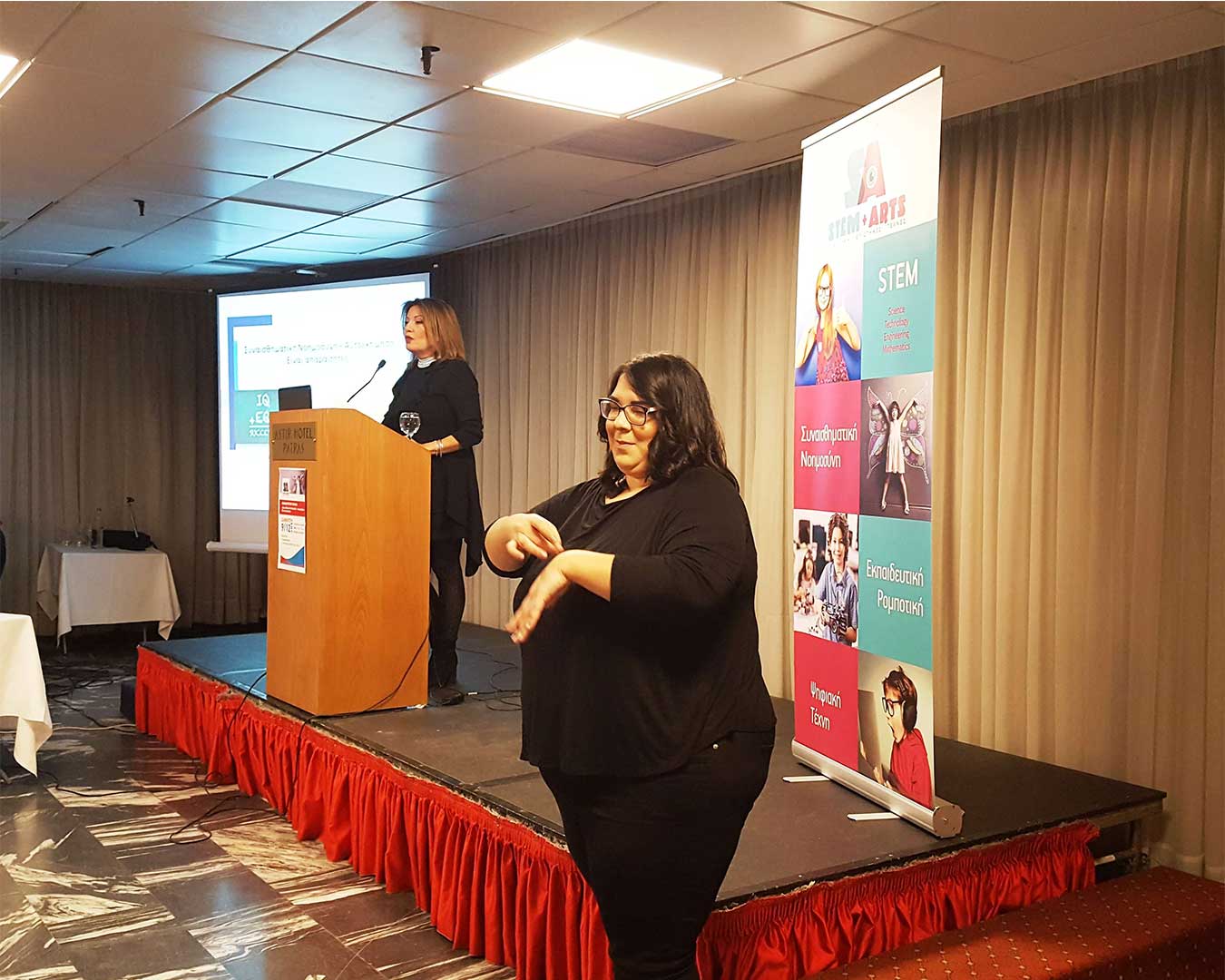 Δεδομένης της κοινωνικής ευαισθησίας του εκπαιδευτικού μας κέντρου, η ομιλία αποδόθηκε και στη νοηματική γλώσσα από την κ. Λαμπρινή Παπαπροκοπίου του Κέντρου Ελληνικής Νοηματικής (Κ.ΕΛ.ΝΟ).