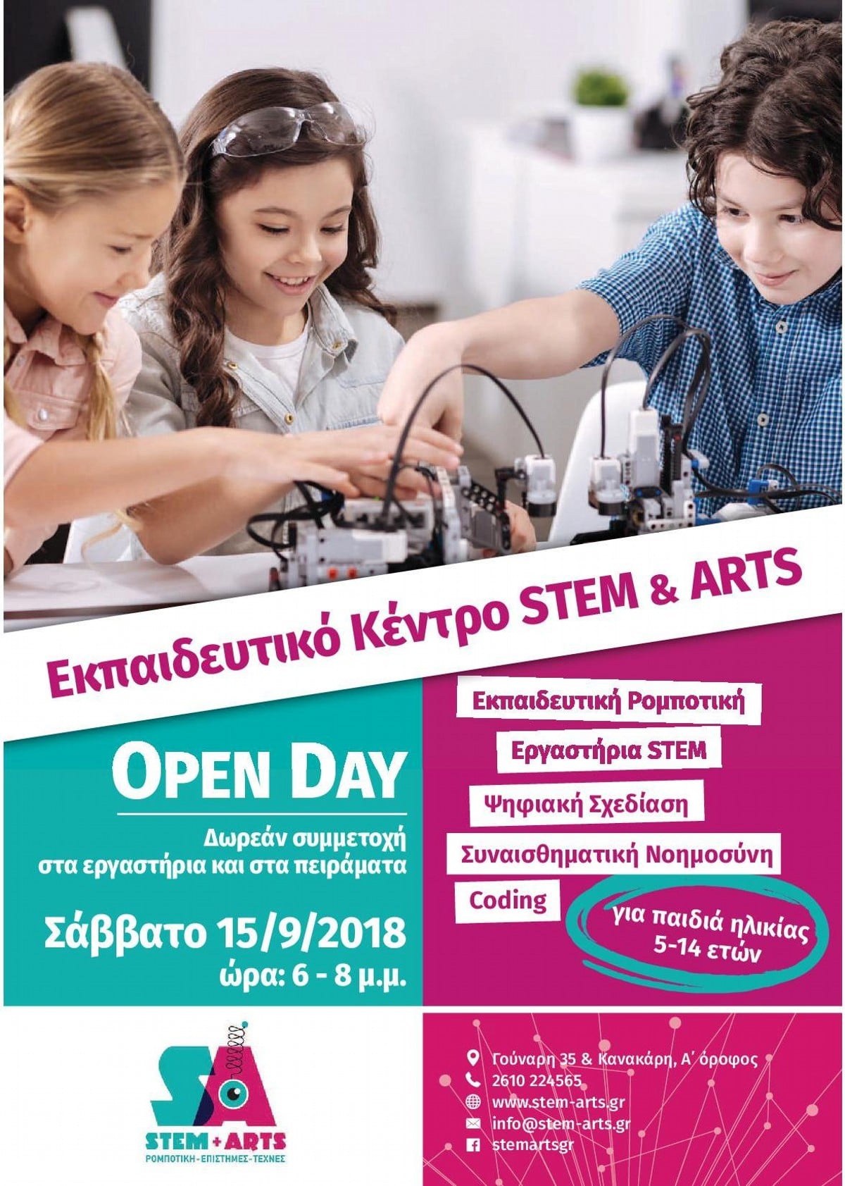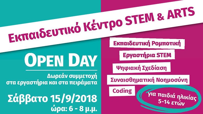 Ένα συναρπαστικό event που θα ενθουσιάσει μικρούς και μεγάλους! Το Σάββατο 15 Σεπτεμβρίου και ώρα 6μ.μ.-8μ.μ. θα πραγματοποιήσουμε το Open Day με ελεύθερη είσοδο για όλους. Κατά τη διάρκειά του θα γίνει παρουσίαση των εκπαιδευτικών μας προγραμμάτων και τα παιδιά θα συμμετάσχουν δωρεάν στα εργαστήρια και στα πειράματα για να προσεγγίσουν τον κόσμο των επιστημών με ευχάριστη διάθεση.
